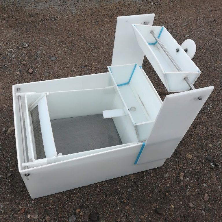 Рыбоводный ящик совершает возвратно-поступательные движения, таким образом вода, поступающая через сетчатое дно перемешивает икру, равномерно распределяя ее в ящике.