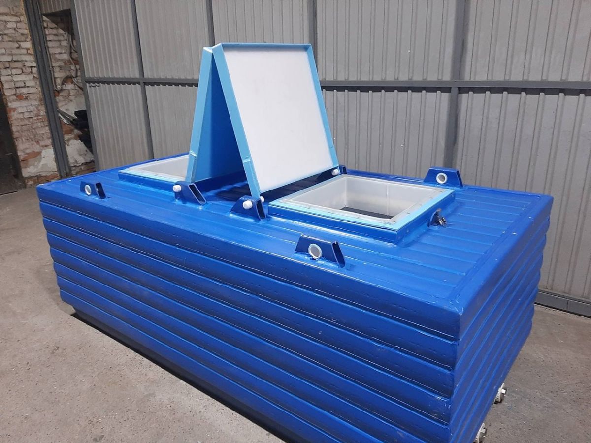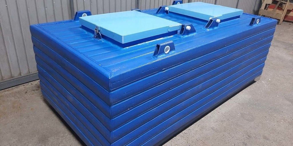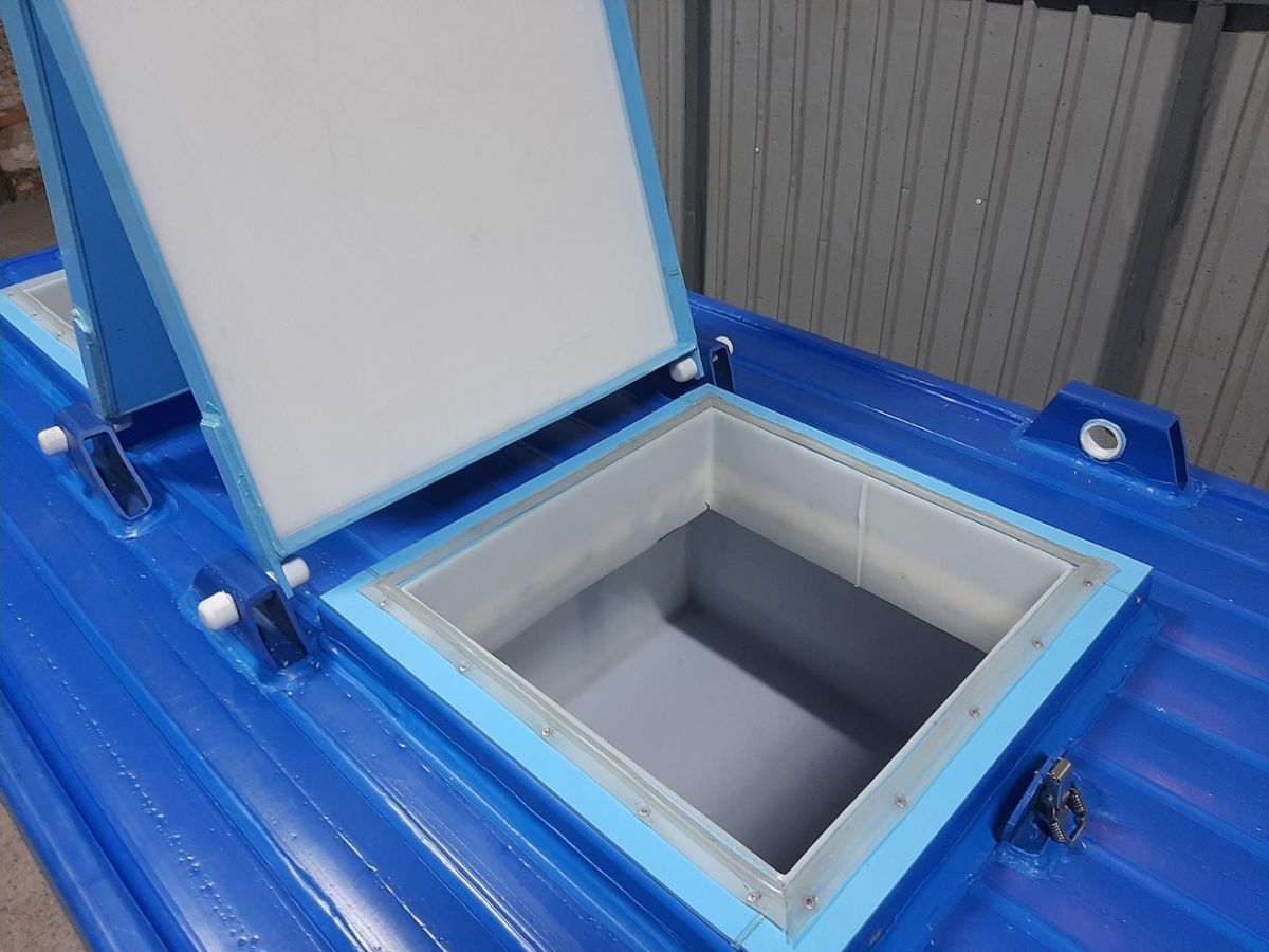 Внутри каркаса находится герметичный вкладыш из листового полипропилена. Для доступа внутрь, емкости укомплектовываются люком с утепленной откидывающейся крышкой, уплотнением и дыхательным клапаном.
